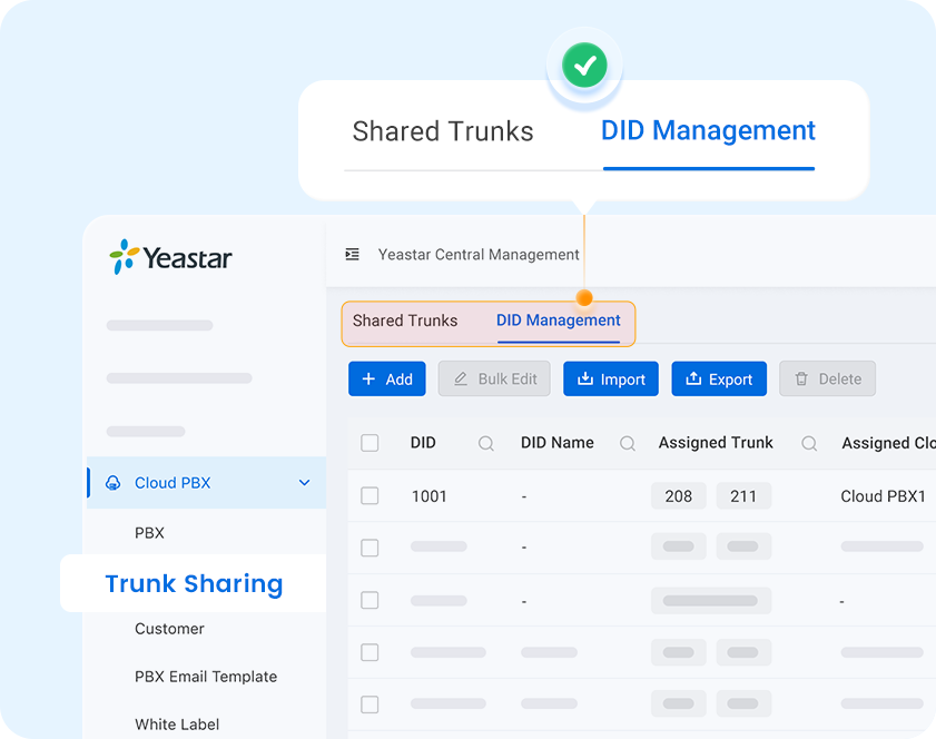 Centralize all SIP trunk and DID resources in one place. Configure a single SIP trunk and share it across multiple Cloud PBXs to eliminate redundant setup. Also, easily bind DID numbers to the trunk and assign them to PBXs in seconds—all from one unified interface. No more repetitive setup and gain centralized control, enhanced security via SBC, and reduced port usage.
