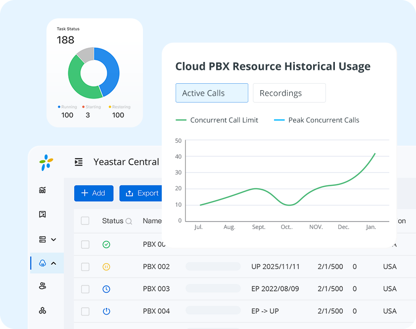 Efficiently manage your diverse customer base all in one place. Yeastar Central Management platform is a game-changer for service provider operations. It simplifies management across multiple PBX instances with automated PBX provisionig template, trunk sharing setup, DIDs assignment, real-time PBX resource usage monitoring, issues alerts, scheduled tasks, and more powerful adminitrator tools.
